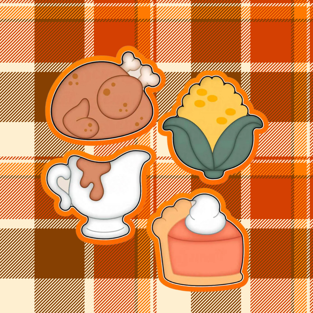 Trade your carving knife for a piping bag - we’re decorating Thanksgiving dinner, cookie-style! Create your own sweet feast with a pumpkin pie slice, roasted turkey, corn on the cob, and gravy boat goodness.