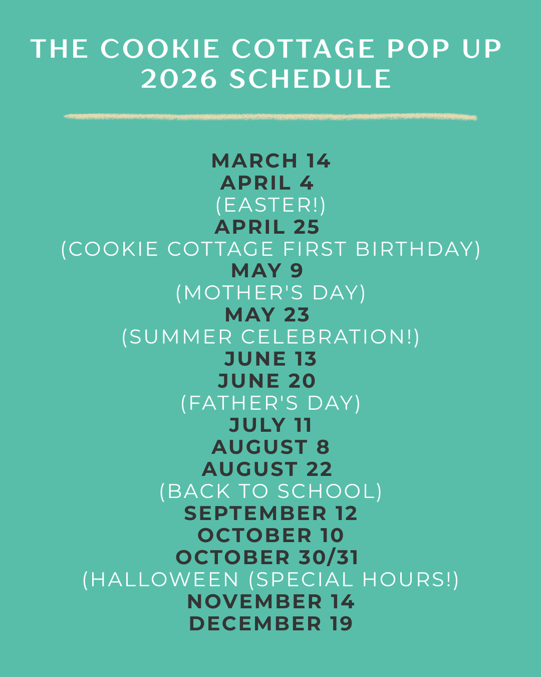 Our 2026 pop-up calendar is officially set! All remaining market dates for the year are now scheduled so you can plan ahead and stop by for your favorite baked goods. We’ll also be highlighting a few special pop-ups around some favorite holidays with fun, seasonal treats along the way.
